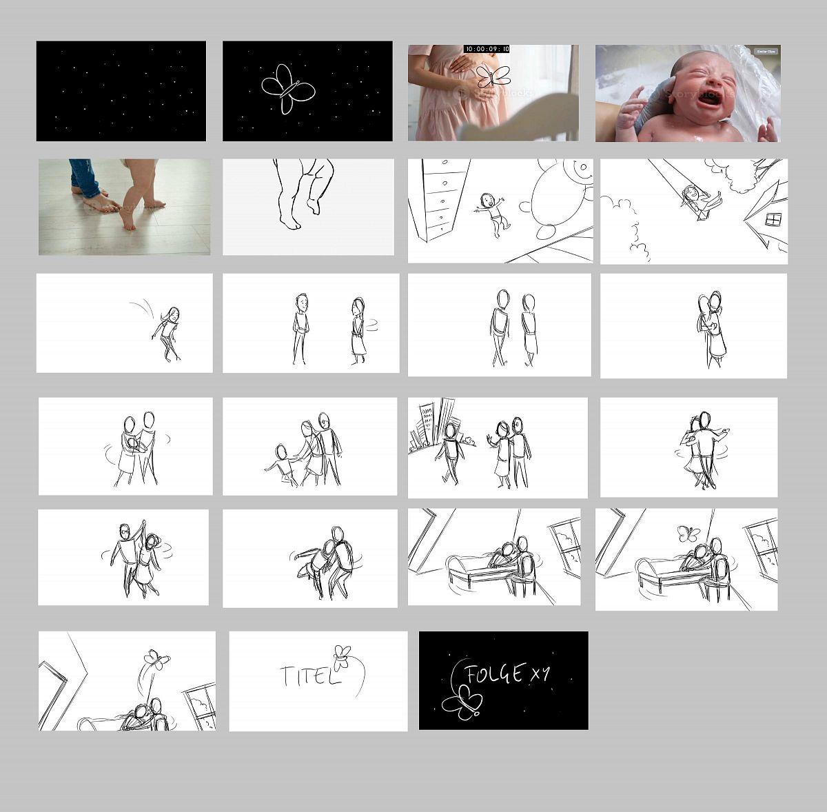 Es galt natürlich nicht nur den Stil zu entwickeln und abzustimmen, sondern auch für alle Folgen gemäß O-Tönen die passenden Szenen zu definieren. Dafür haben wir Storyboards erstellt und abgestimmt, diese waren die Basis für unsere Illustrations-Arbeiten. Hier als Beispiel das Storyboard zum Intro:
