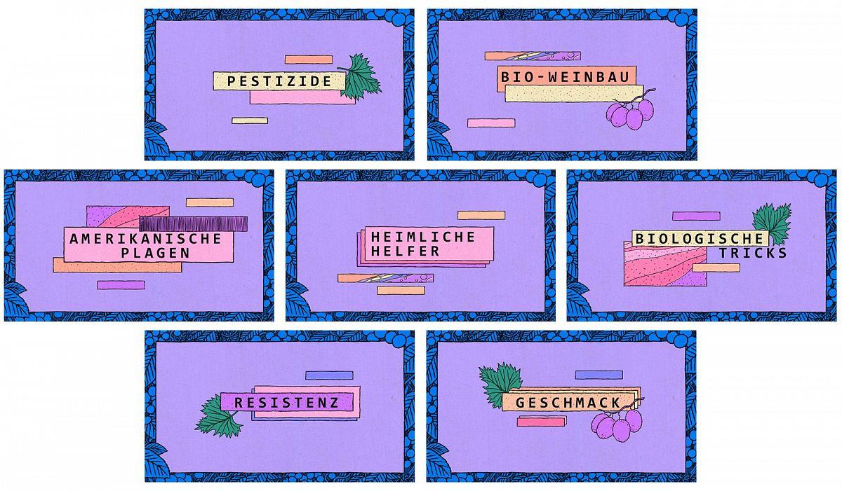 Wir haben diese Dokumentation von K22 Film über Biowein mit einem umfassenden Grafikpaket unterstützt: In mehreren Animationssequenzen werden Schädlinge, ihre Herkunft und Auswirkungen erklärt. Außerdem haben wir Titelkarten, Bauchbinden und Zwischentitel entworfen.
