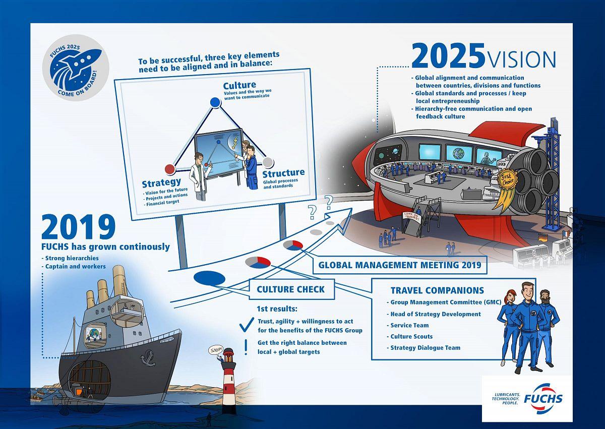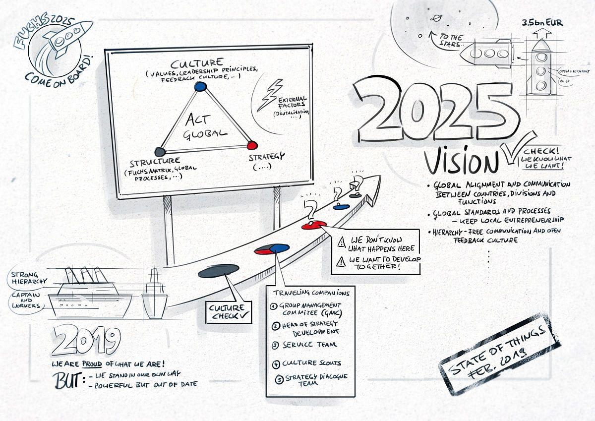 Für das Unternehmen FUCHS SE aus Mannheim durften wir im Zuge eines Workshops mit Graphic Recordings den Startschuss zur internen Initiative FUCHS2025 mitbegleiten. Die gezeichneten Protokolle dienten auch nach dem Workshop noch als Grundlage für weitere strategische Maßnahmen, so dass FUCHS SE auf uns zukam und fragte, ob wir uns nicht vorstellen könnten, den ganzen FUCHS2025 Prozess mit grafischen Elementen auch weiterhin zu unterstützen. Für uns natürlich eine grosse Ehre und der Beginn einer tollen und engen Zusammenarbeit mit der Marketing Abteilung von FUCHS.