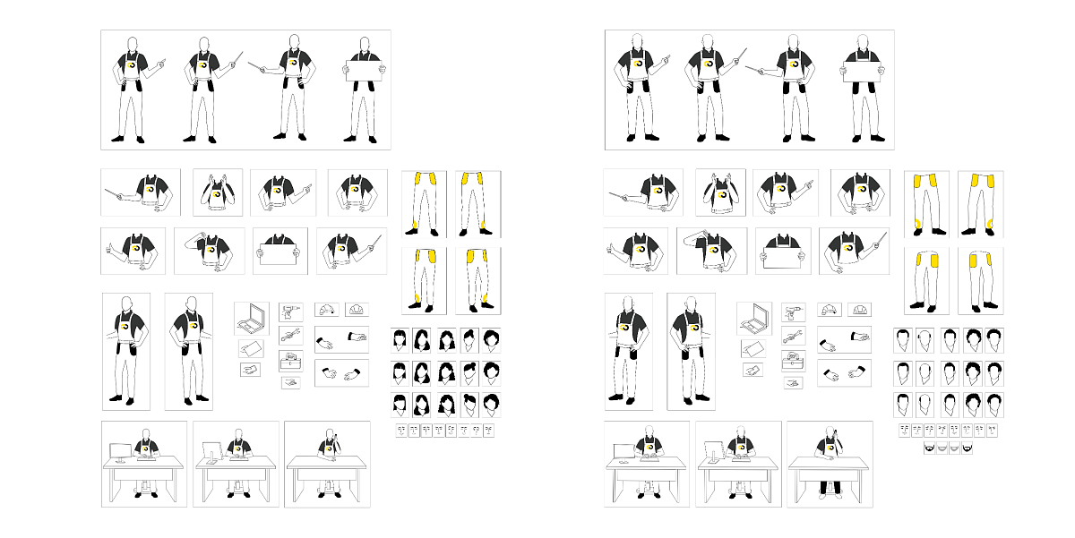 Nach Auswahl des gewünschten Stils haben wir einen Baukasten erstellt. Mit diesem können Mitarbeiter*innen ihre je nach Thema benötigten Character für Präsentationen selbst zusammenstellen. Dabei wählen sie aus einer Reihe verschiedener Körperposen und Kleidungsstücken sowie Köpfen mit unterschiedlichen Frisuren.