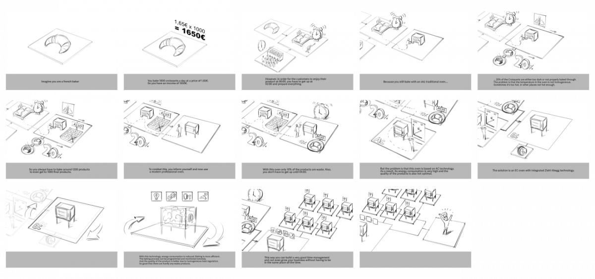 Das grobe Konzept wurde dann in ein Storyboard übertragen, um die bildliche und textliche Erzählung des gesamten Ablaufs zu demonstrieren. Hierdurch wurde außerdem noch weiter geklärt, welche Elemente für den gesamten Film nötig sein würden.